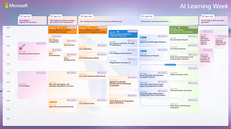 - Fünftägiges Online-Event vom 8.-12. September 2025 mit über 40 kostenlosen Sessions zu KI-Grundlagen, Copilot-Anwendungen und Azure-Services